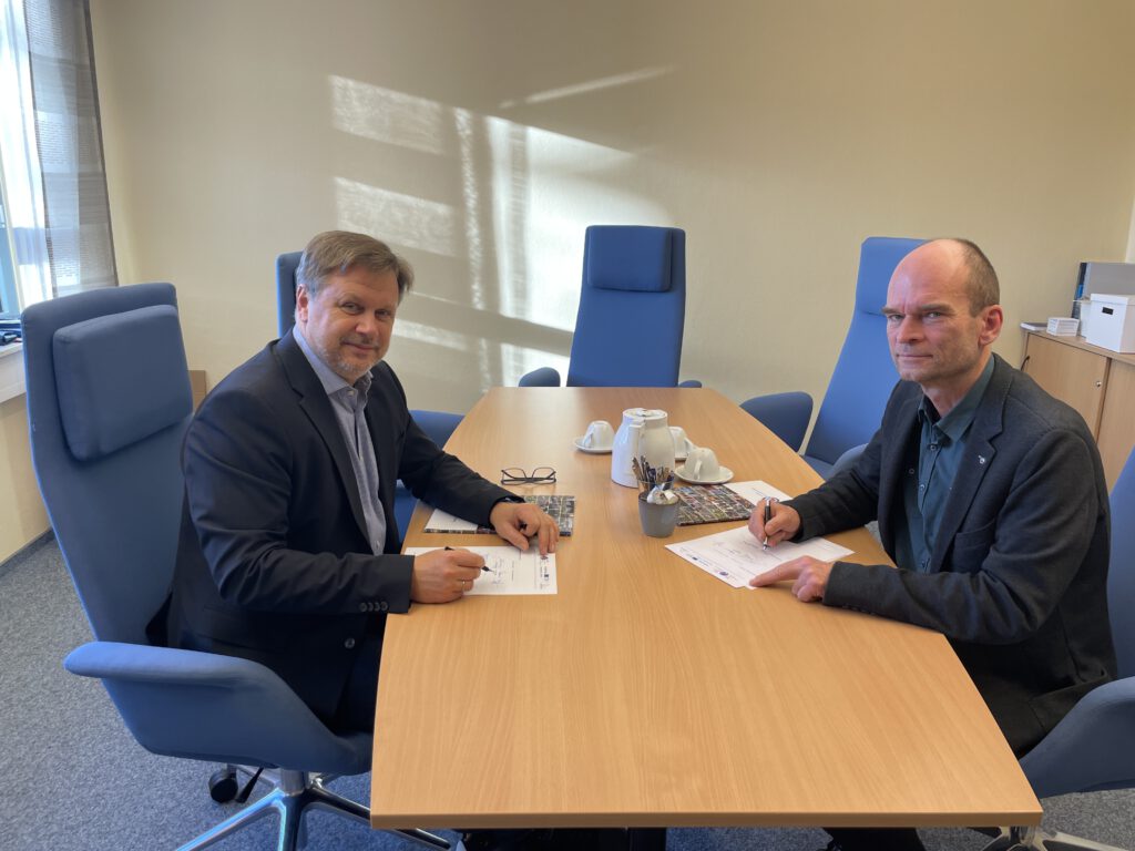 Foto: Unterzeichnung Kooperationsvereinbarung zum Aufbau des GIP-Netzwerkes für die Euroregion PRO EUROPA VIADRINA (Archiv Euroregion PEV, Mittlere Oder e.V.) (Frank Steffen (l. Landrat Landkreis LOS), Toralf Schiwietz (r. GF ER PEV, MOev))