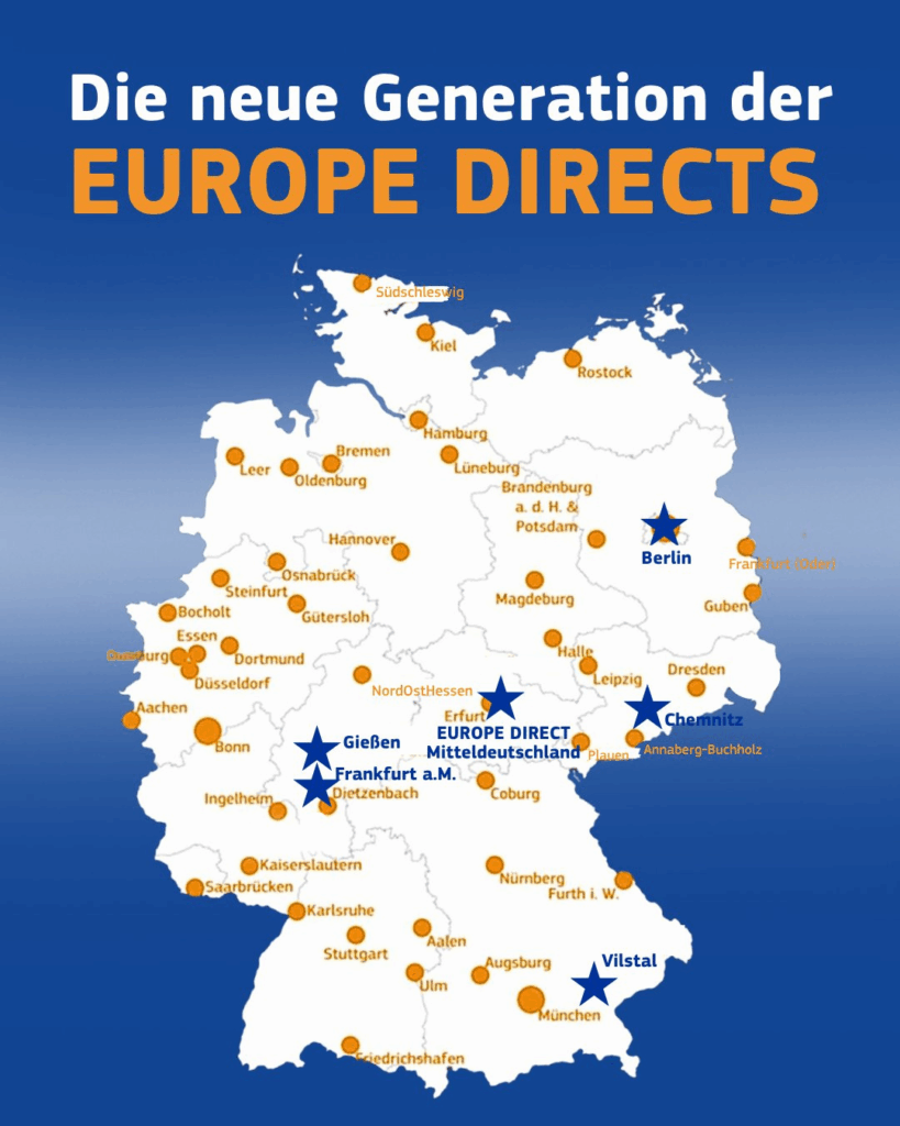 Die Ausschreibung der Europäischen Kommission für die nächste Generation EUROPE DIRECT 2026-2030 ist abgeschlossen: In Deutschland werden 48 dieser Zentren zum 1. Januar 2026 an den Start gehen und Ansprechpartner für alle Bürgerinnen und Bürger zu Fragen rund um die EU sein.